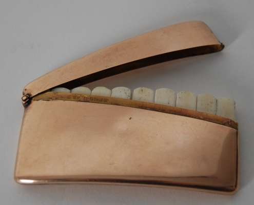 Chester 1906, of slender curved form with hinged cover, enclosing ten bone markers each with black stained numerals