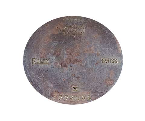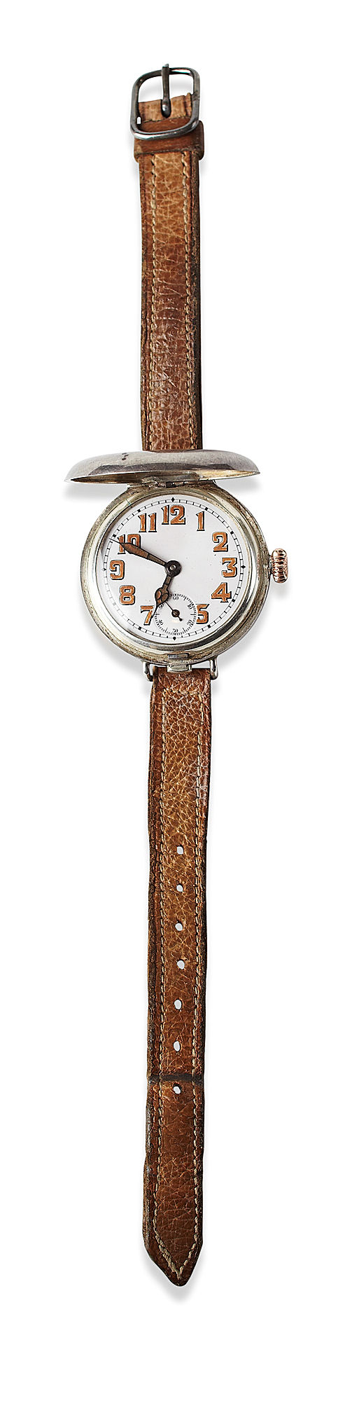 the silver case, with sprung hinged cover, engraved Rolex Swiss and numbered 774096, white enamel dial with luminous numerals, blued hands and luminous panels, subsidiary seconds hand, signed movement, narrow leather strap