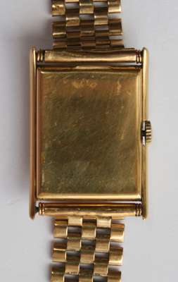 the curved tank shape case with two tone dial, subsidiary seconds dial, gilt numerals, flexible 9ct gold bracelet