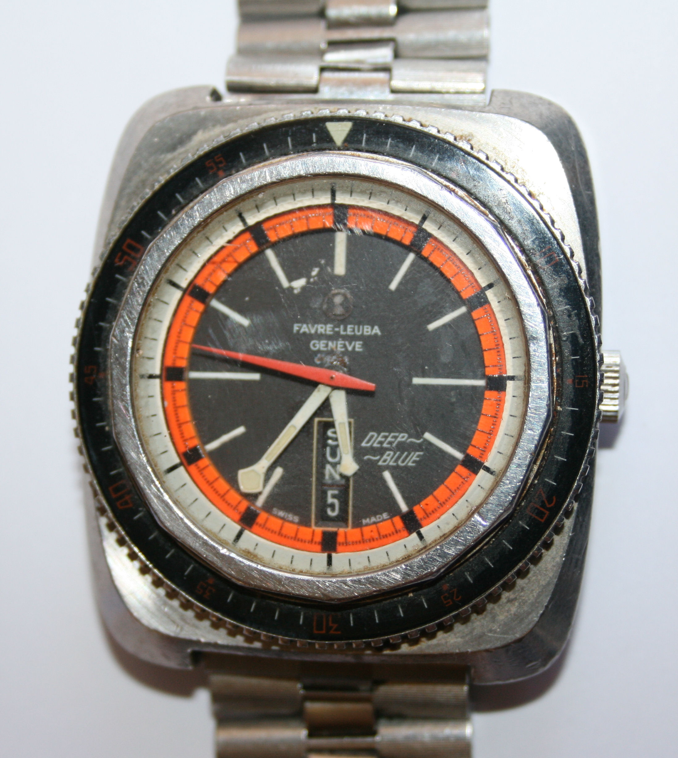 Deep Blue model, rotating bezel, black dial, sweep second hand, day and date indicator, original stainless steel bracelet