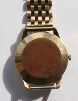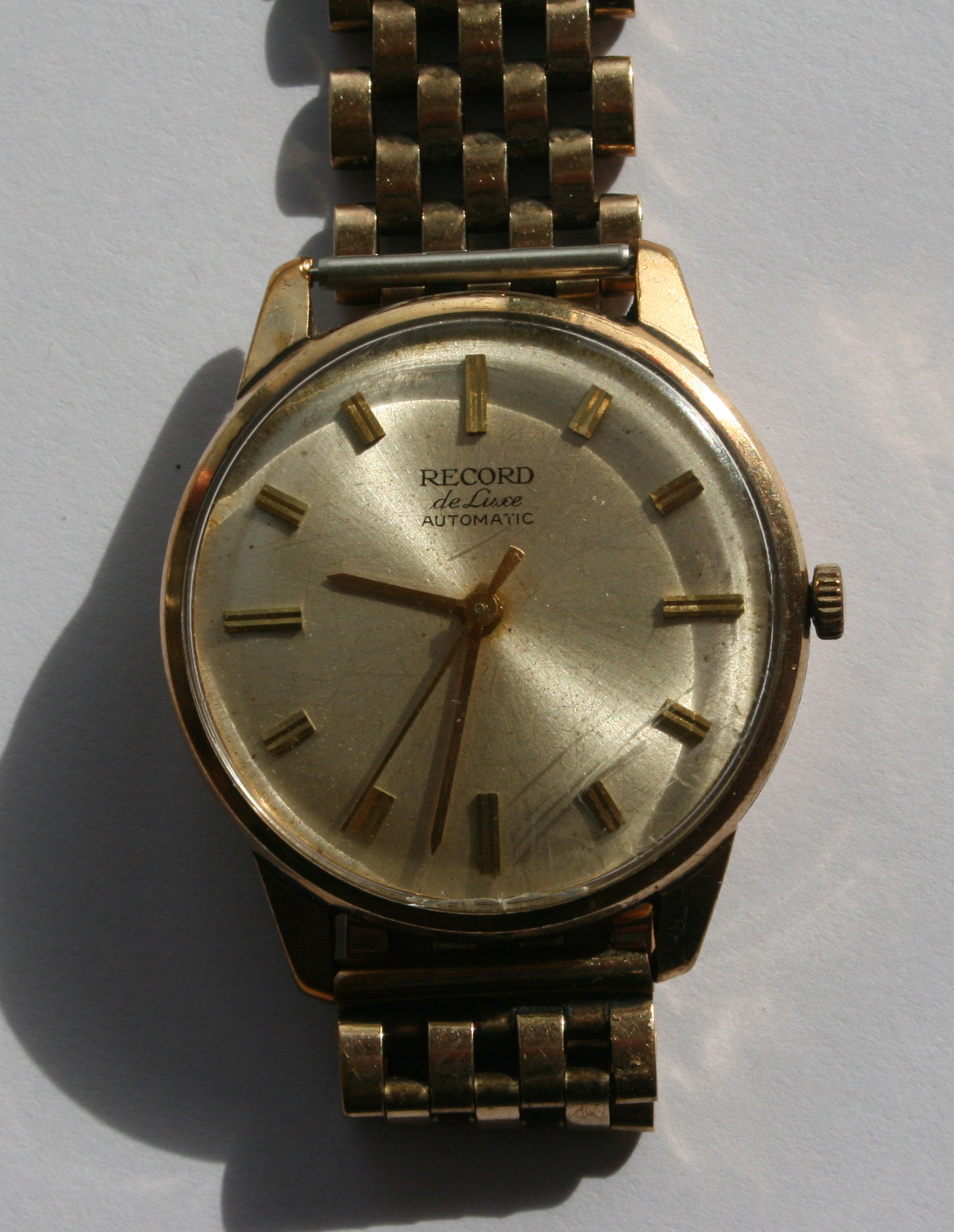 the champagne dial with baton numerals, sweep second hand, inscribed 'Record de Luxe Automatic' 9ct gold flexible bracelet