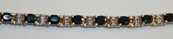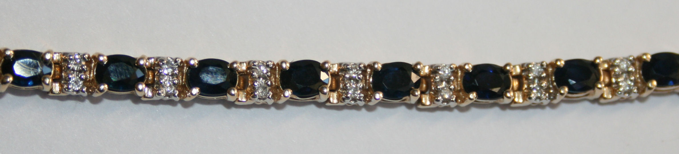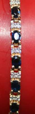 claw set with oval cut sapphires interspersed by pairs of round brilliant cut diamonds, with concealed clasp and safety clip, stamped 10K