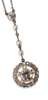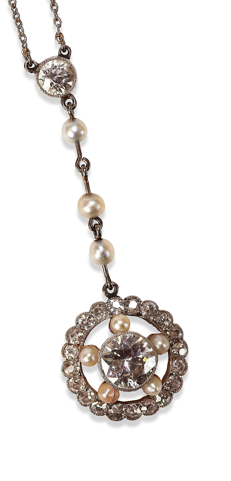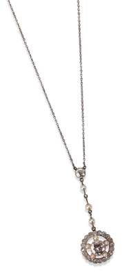 composed of fine belcher form links, millegrain collet set to the centre front with an old European cut diamond, surmounting a line of three seed pearls, suspending a larger similarly set old European cut diamond within borders of seed pearls and single cut diamonds, contained in a tooled brown leather fitted case stamped SUTHERLAND & HORNE ...EDINBURGH