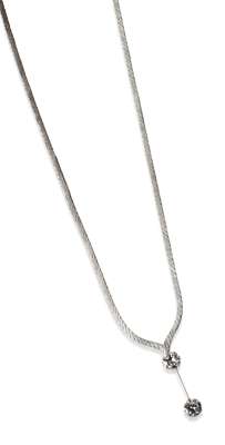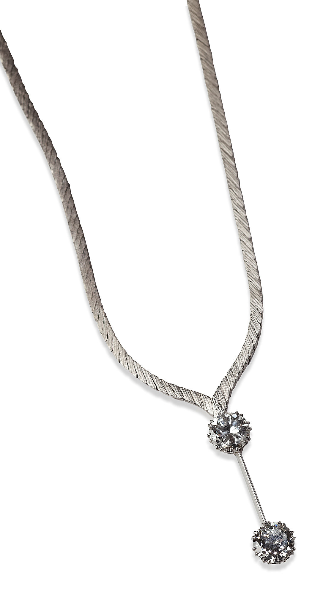 composed of satin-finished flattened fancy links, suspending two graduated round brilliant cut diamonds conjoined by a knife bar, with box form clasp and safety clip, clasp also stamped 7807