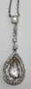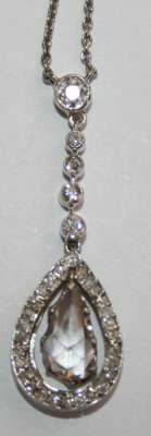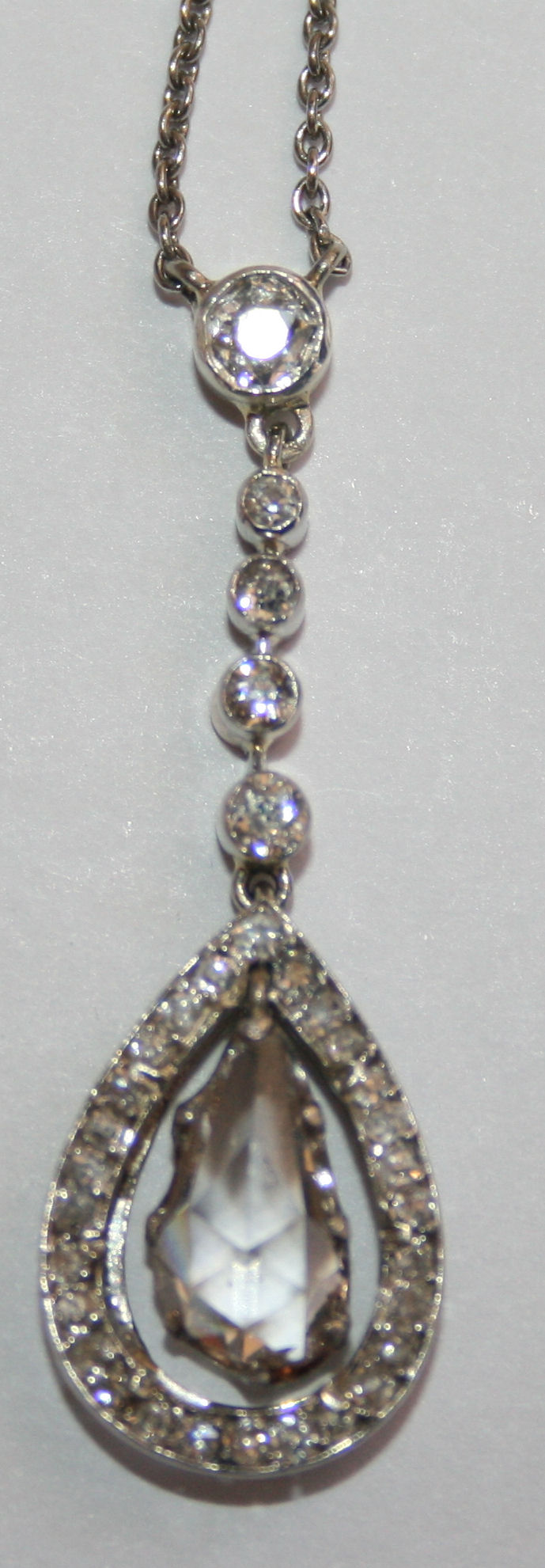 composed of fine belcher form links, collet set to the centre front with a line of five graduated old European cut diamonds, surmountign an ovoid drop claw set to the centre with an ovoid rose cut diamond within an open border of smaller old European cut diamonds