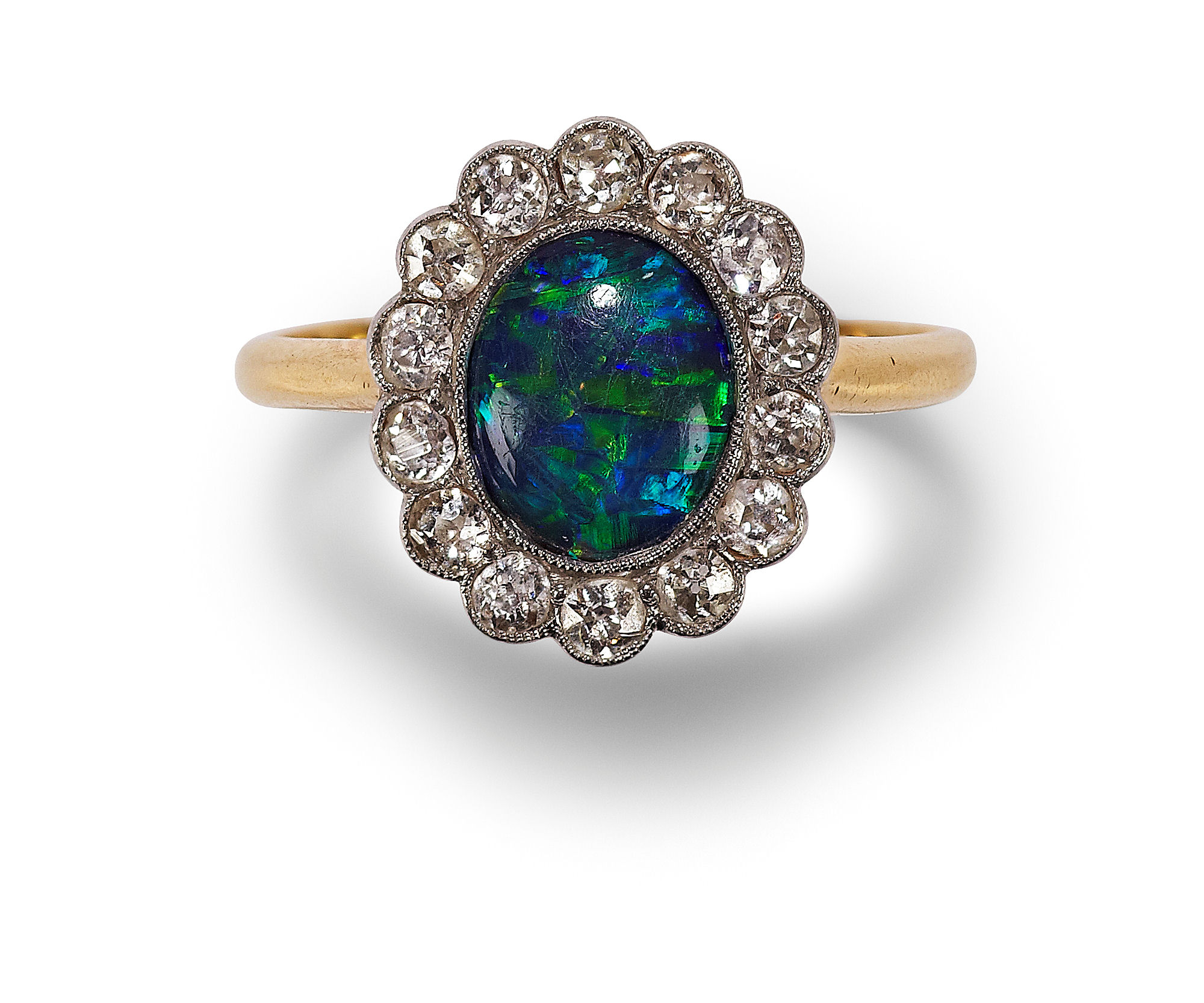 millegrain collet set to the centre with an oval cut black opal, within a border of fourteen old European cut diamonds