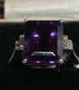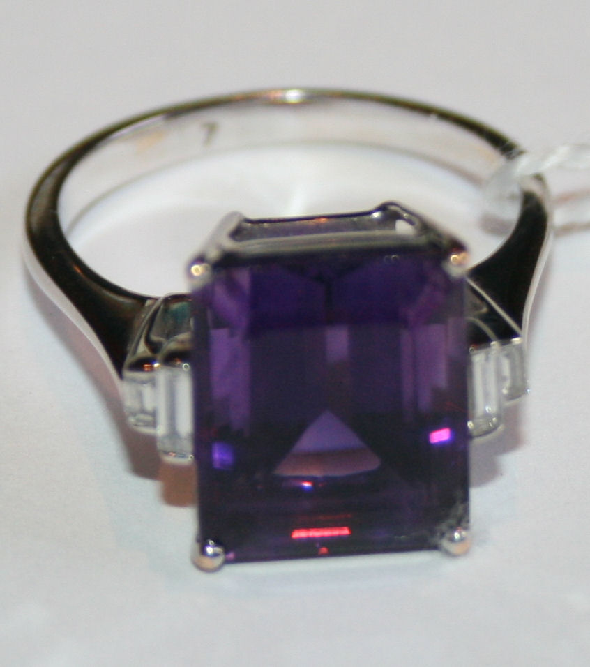 the central corner claw set trap cut amethyst flanked to either side by two graduated baguette cut diamonds, shank stamped 750