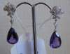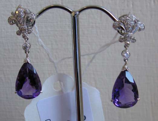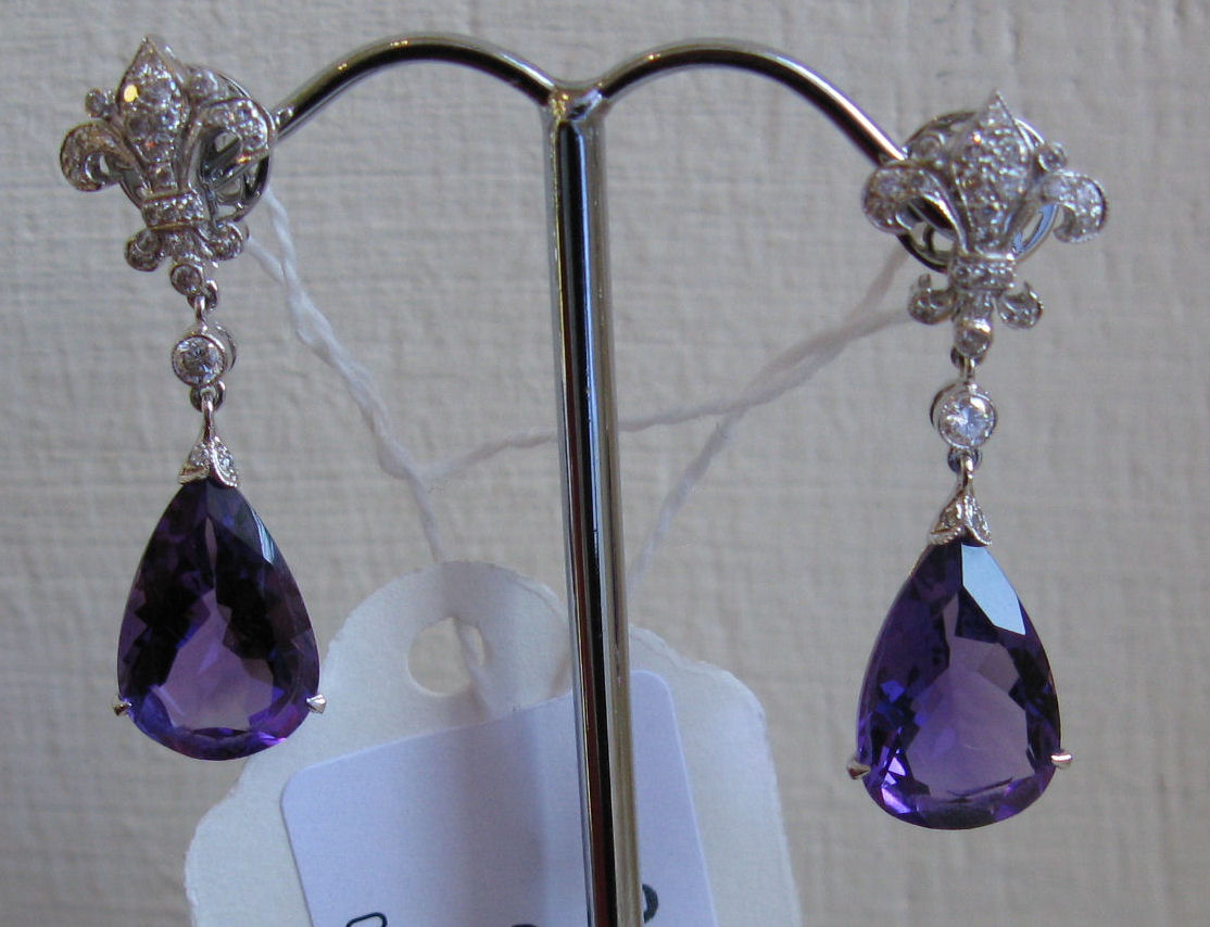 each composed of a fleur de lys scroll, millegrain set with graduated round brilliant cut diamonds, suspending a large claw set pear cut amethyst drop, mounts stamped 750