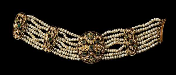 comprising a bracelet and matching pendant, the bracelet designed as a broad band composed of seven rows of off-round freshwater cultured pearls, each measuring approximately 3mm-4mm diameter, applied with four graduated pierced oval plaques collet set with circular and trap cut emeralds and seed pearls, with concealed clasp; the pendant of fringed scroll design similarly set with emeralds and seed pearls (2)