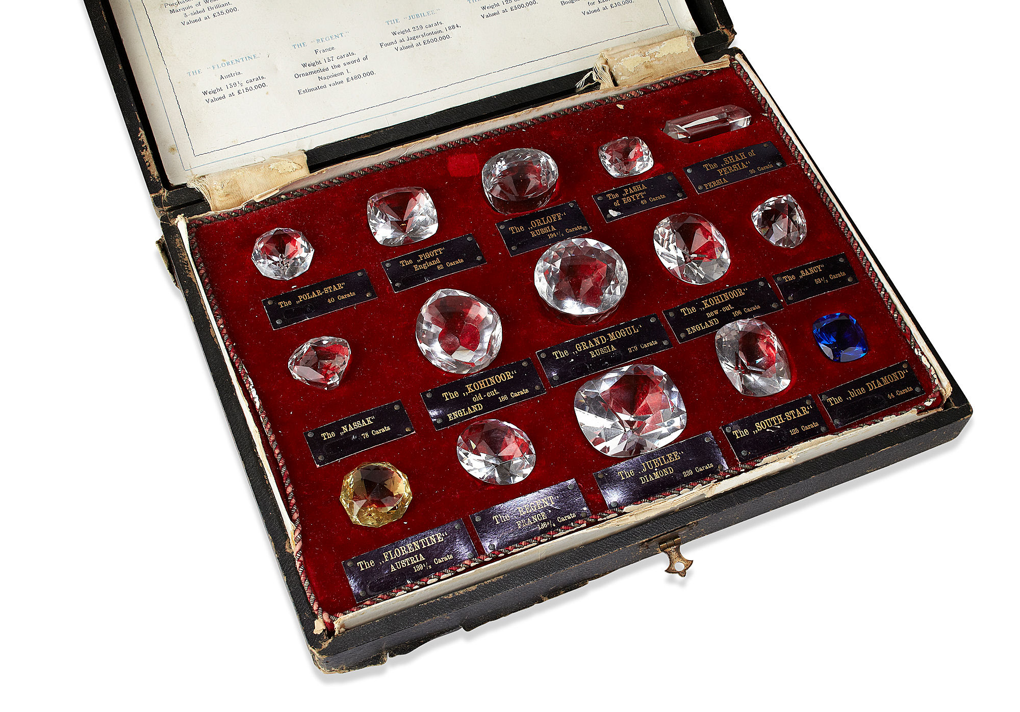 containing fifteen replicas, each with accompanying title and carat weight, with additional description and 'valuation', contained in a red velvet lined fitted case