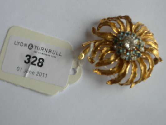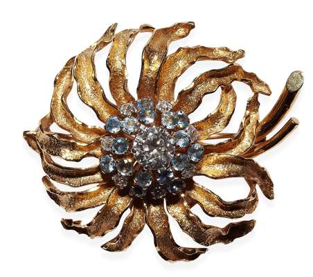 HGM Birmingham, of textured whorl form, central claw set circular cut diamond approximately 1ct, with a stepped surround of aquamarines and diamonds