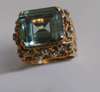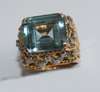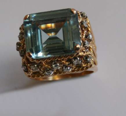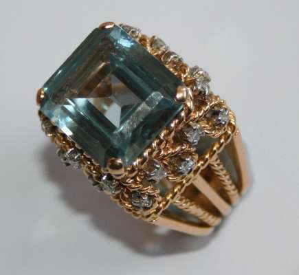 corner claw set with a large trap cut pale blue spinel (probably synthetic), to a raised ropetwisted gallery, claw set with single cut diamonds, to a tapering shank also incorporating ropetwisted borders, stamped with French control marks