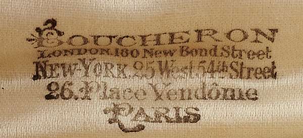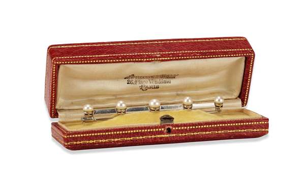 circa 1910-20, engraved Boucheron Paris and with French control marks, white gold knife edge bar with five onset pearls, pin with push catch, in fitted Boucheron box