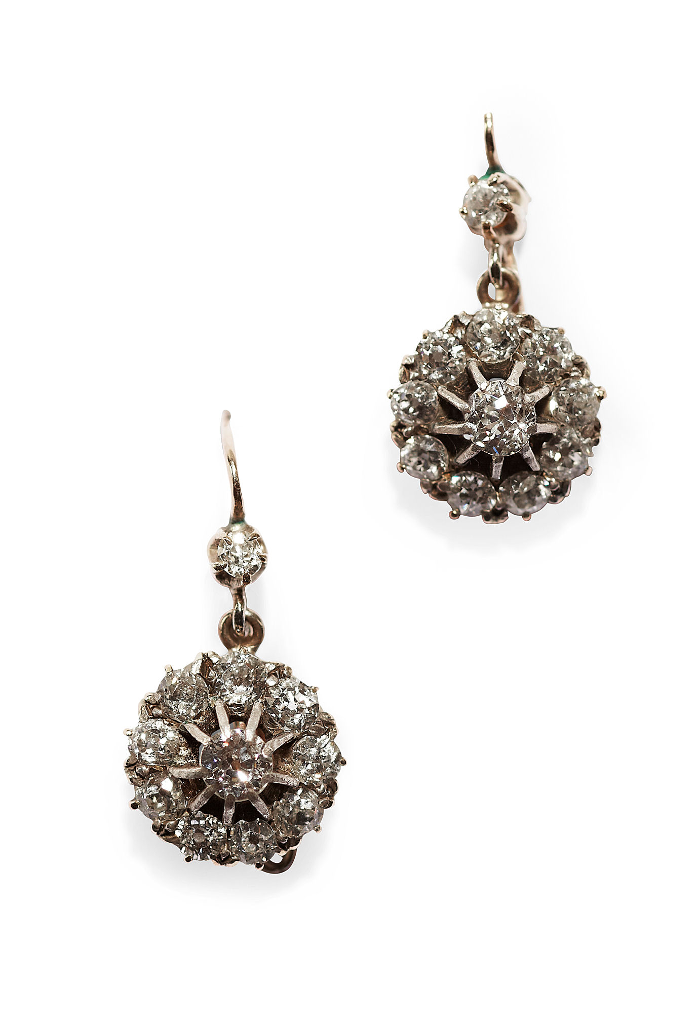 each claw set with an old European cut diamond, surmounting a circular drop, claw set to the centre with a larger old European cut diamond within a surround of nine similarly cut diamonds, with wire and clip fittings