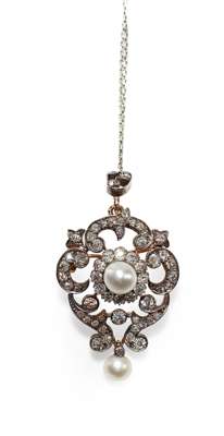 the pendant of open scroll design, set to the centre with a bouton shaped pearl measuring approximately 6.4mm diameter, within an open scroll surround set with graduated old mine and single cut diamonds, suspending a bouton shaped pearl drop, measuring approximately 5.65mm diameter, with similarly cut diamond set detachable bale, with detachable brooch fitting and fine belcher link chain, contained in a tooled dark grey leather fitted case stamped HANCOCKS' & CO…(Pearls untested)