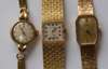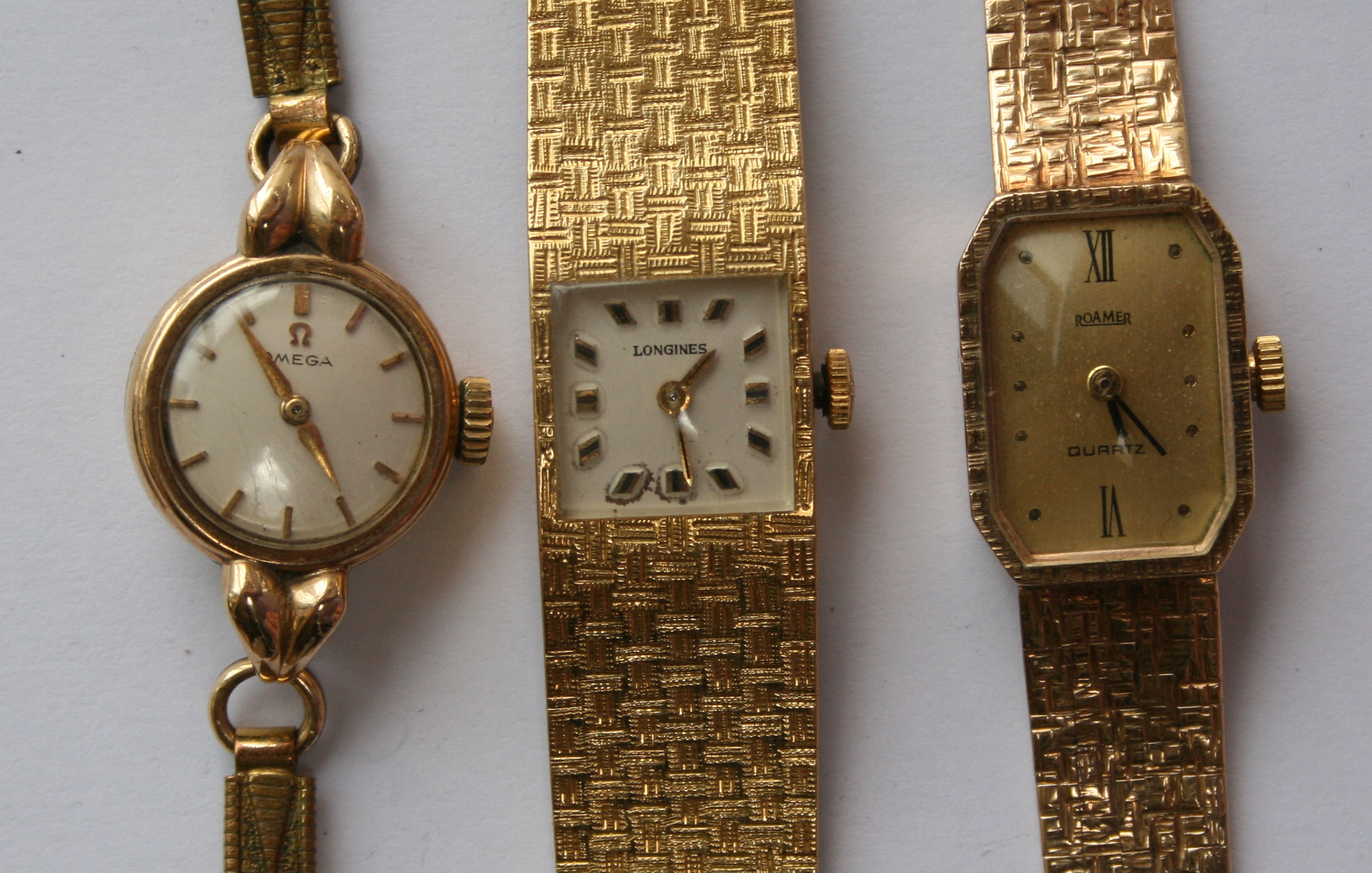 the square champagne dial inscribed 'Longines', baton numerals, basket weave tapering 18ct gold flexible bracelet, together with a ROAMER 9ct gold wrist watch, flexible gold bracelet and an Omega 9ct gold watch with gilt strap