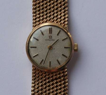 the circular champagne dial with gilt baton numerals, inscribed 'Omega' flexible mesh bracelet