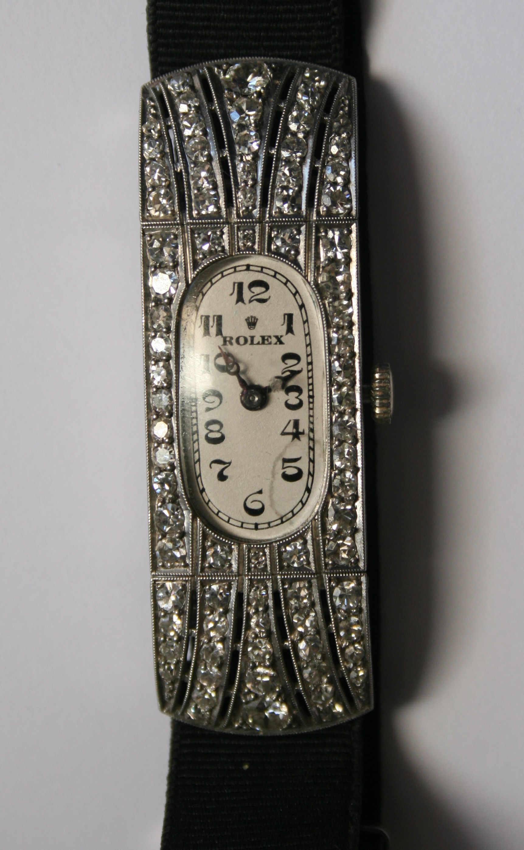 of diamond set rectangular form, the elongated oval dial inscribed Rolex, Arabic numerals, the movement also signed and marked 'Observatory Quality' the platinum case numbered 42998, engraved to the rear, the curved case with millegrain set diamonds