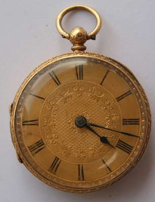 open faced, key wind, lever movement, gilt dial, foliate decorated case, with a gold belcher link double Albert, with tassel and T bar