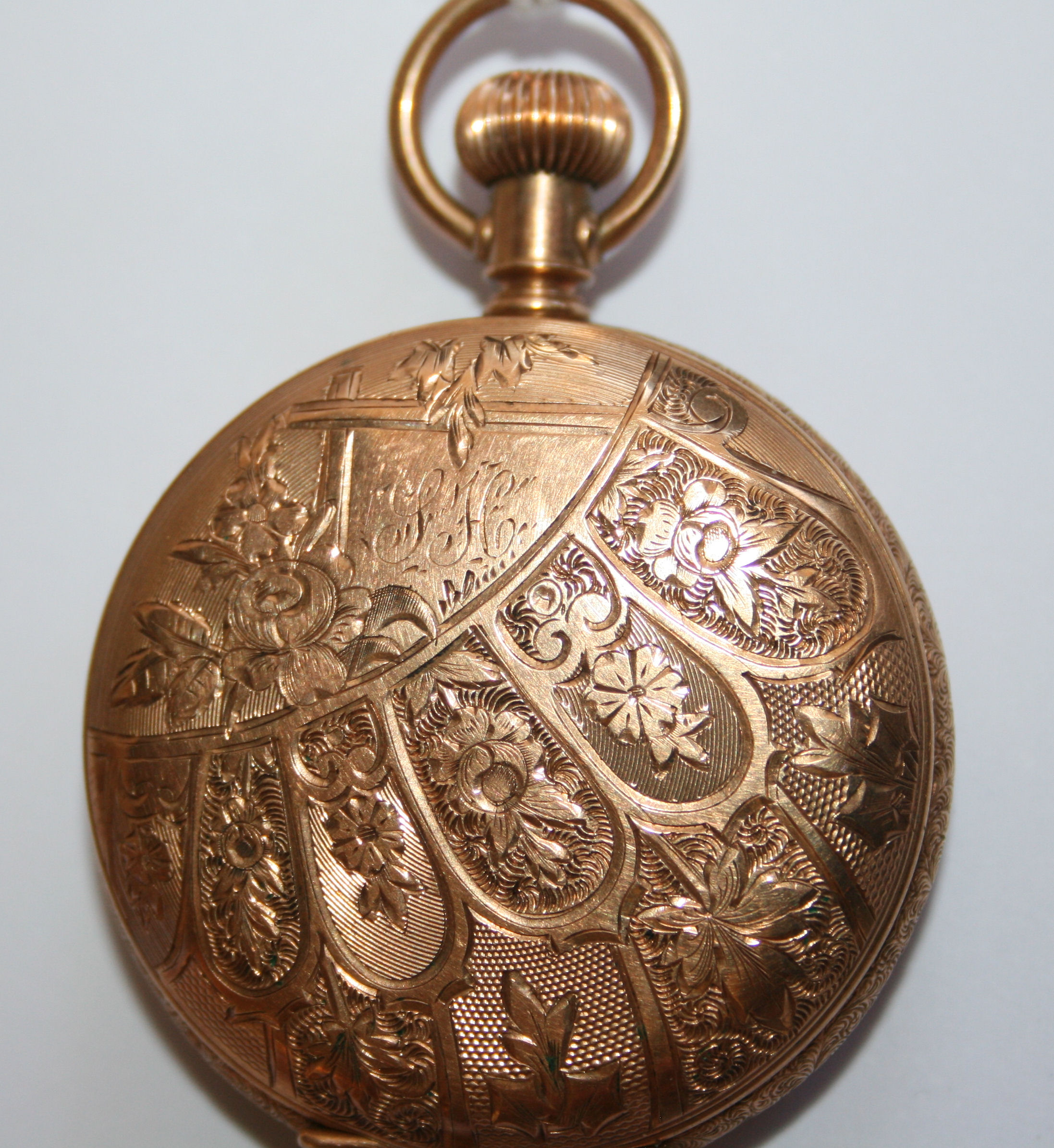 in full hunting case, keyless wind, enamel dial inscribed Illinois as is the lever movement, the outer case with floral decoration