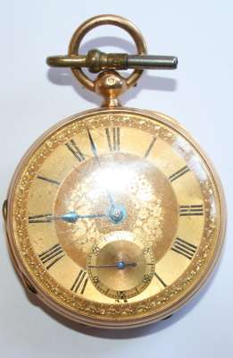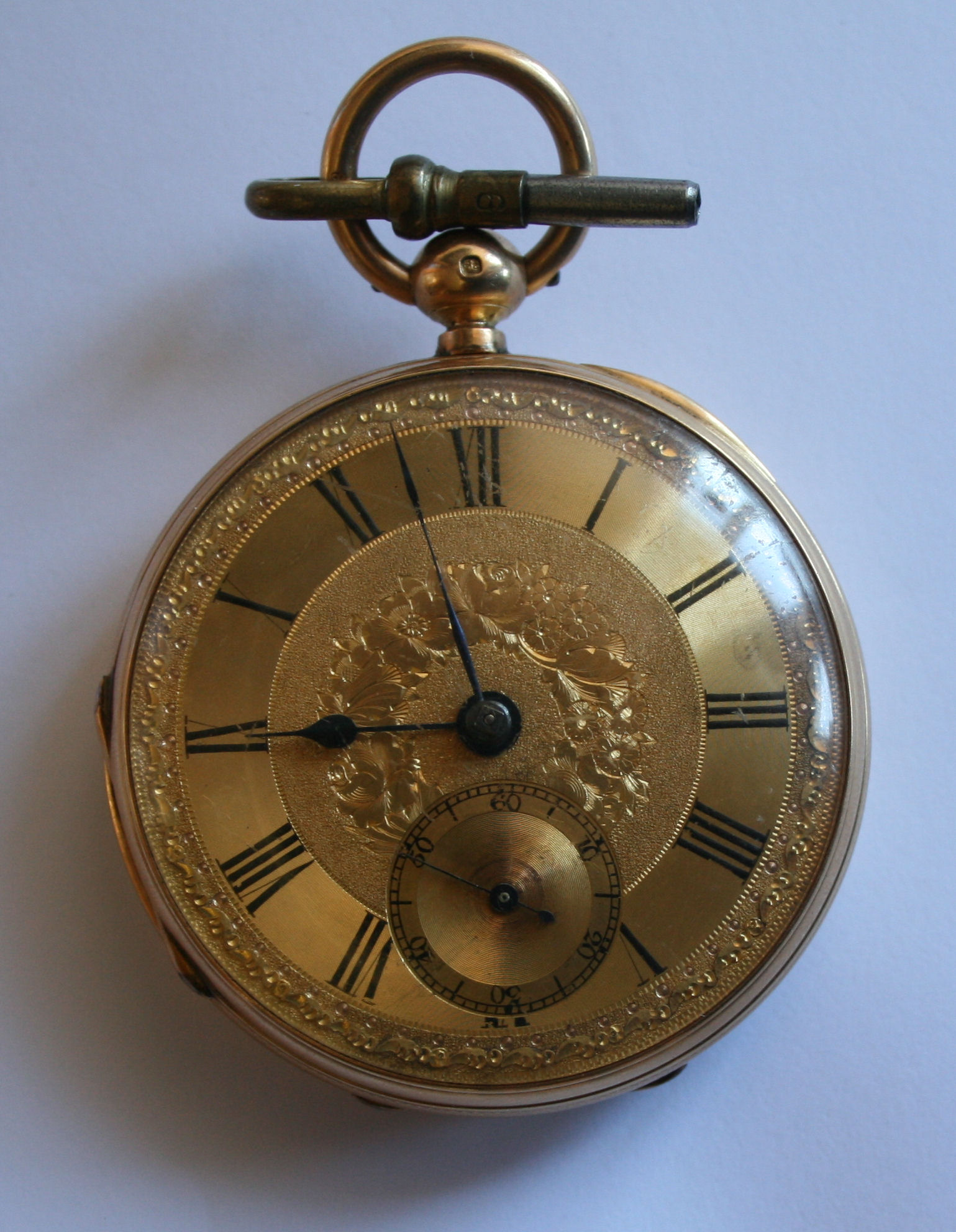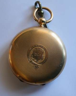 open faced, key wind, gilt dial with Roman numerals, subsidiary seconds dial, engine turned case, engraved M Purdon, dated 1874, the lever movement signed Bennett, Oxford Corner, Glasgow