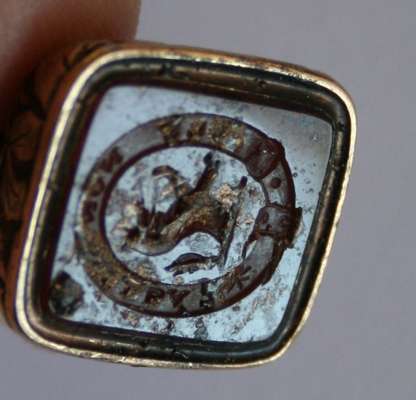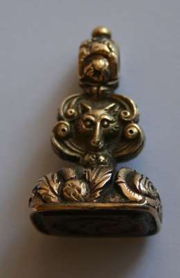 of small size, keyless wind, enamel numerals to the outer case, engraved monogram to the rear, modern gilt chain and a fob seal with chased fox head and foliate detail, engraved intaglio