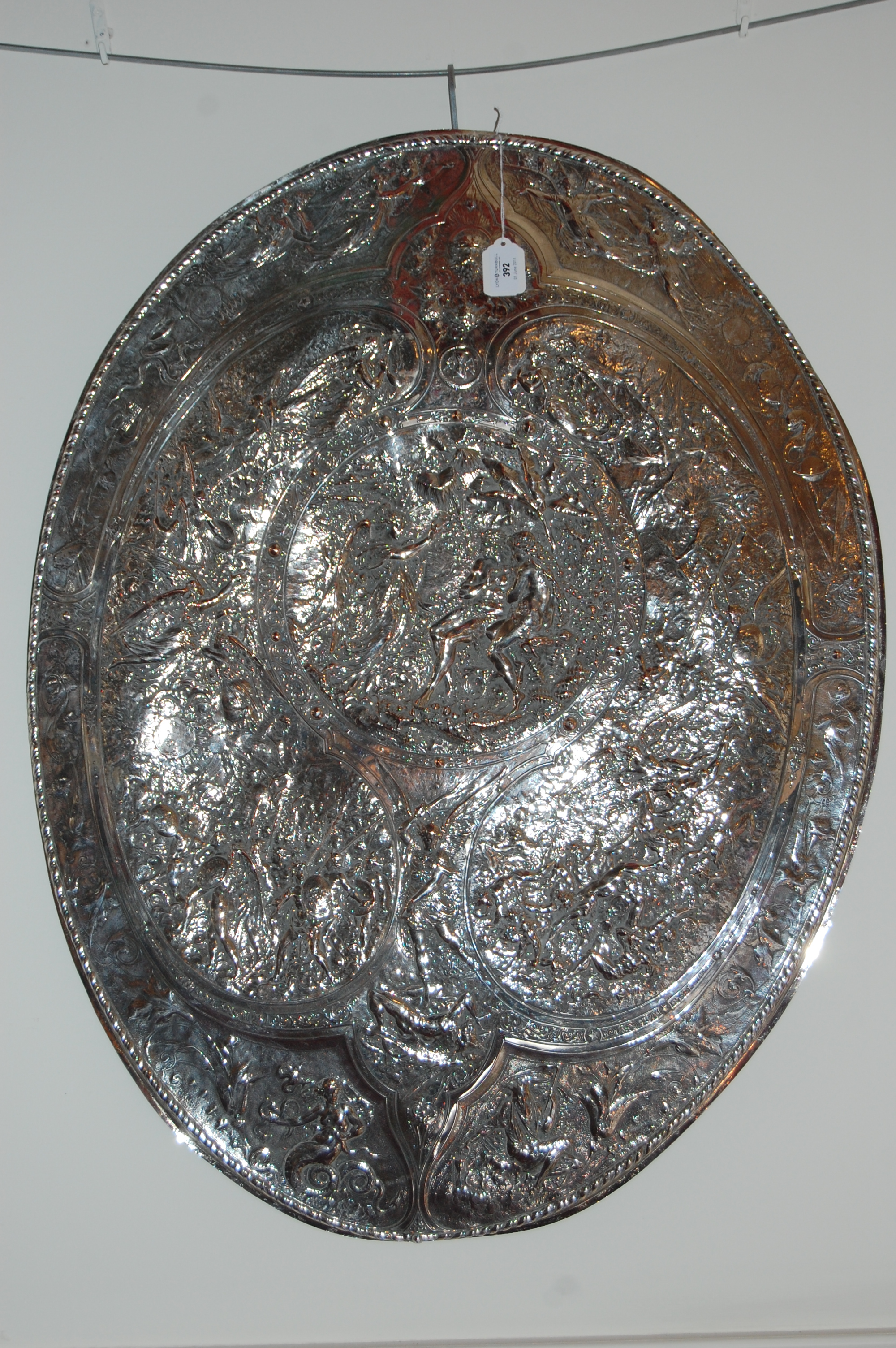 Notes: this impressive piece of classical silverwork by Elkington & Co is an electrotype copy of 'The Milton Shield' originally by Morel Ladeuil, featuring representations of the Archangel Raphael, Adam and Eve the 'war in heaven'. The outer borders show further scenes from Milton's epic poem Paradise Lost.