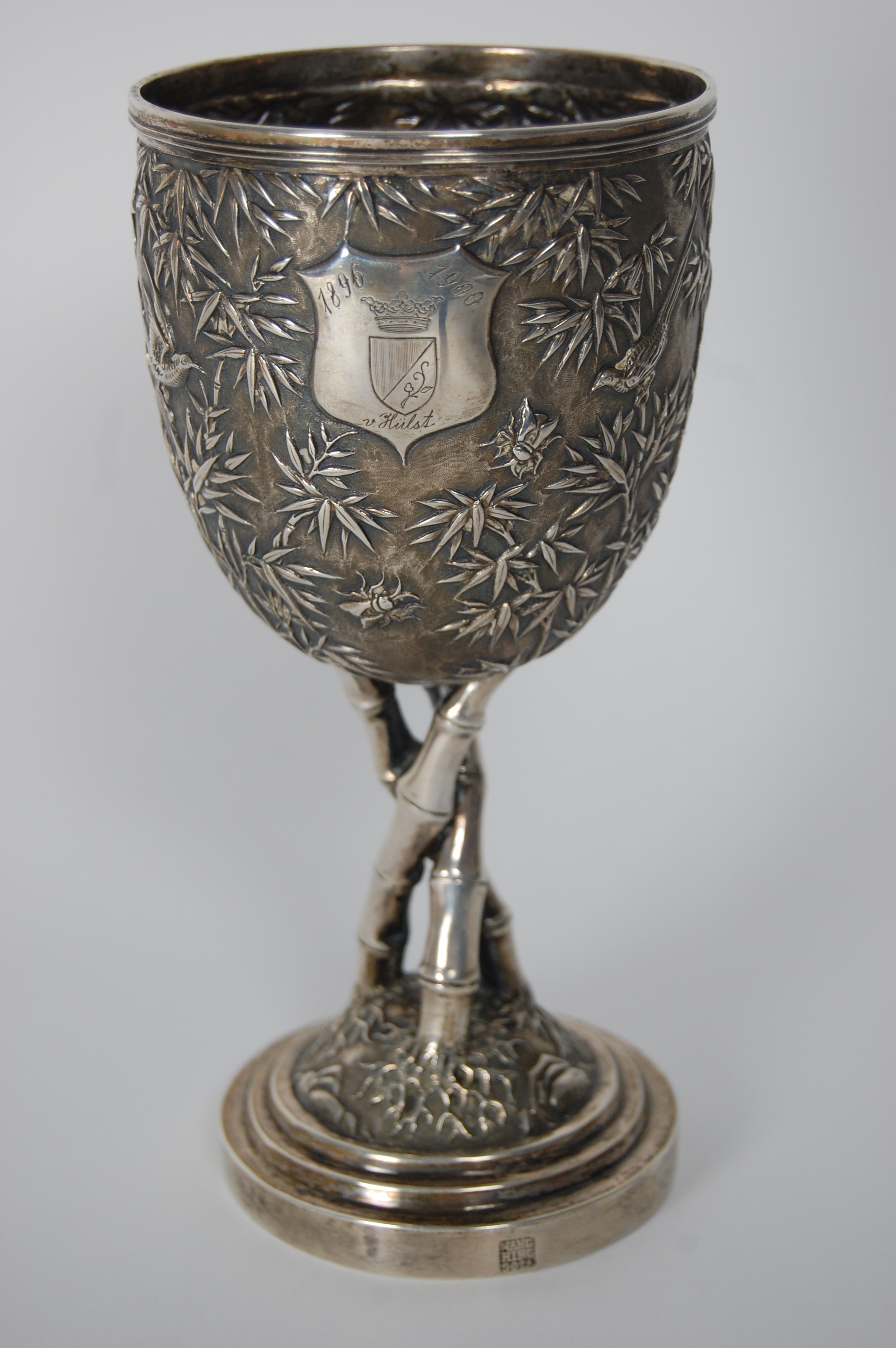 marked WANG / HING / 90 and two character marks, the deep bowl embossed with bamboo, birds and insects, the shield shaped cartouche with engraved armorial shield dated 1896 / 1900, the stem formed from three intertwined bamboo stalks above a naturalistic base