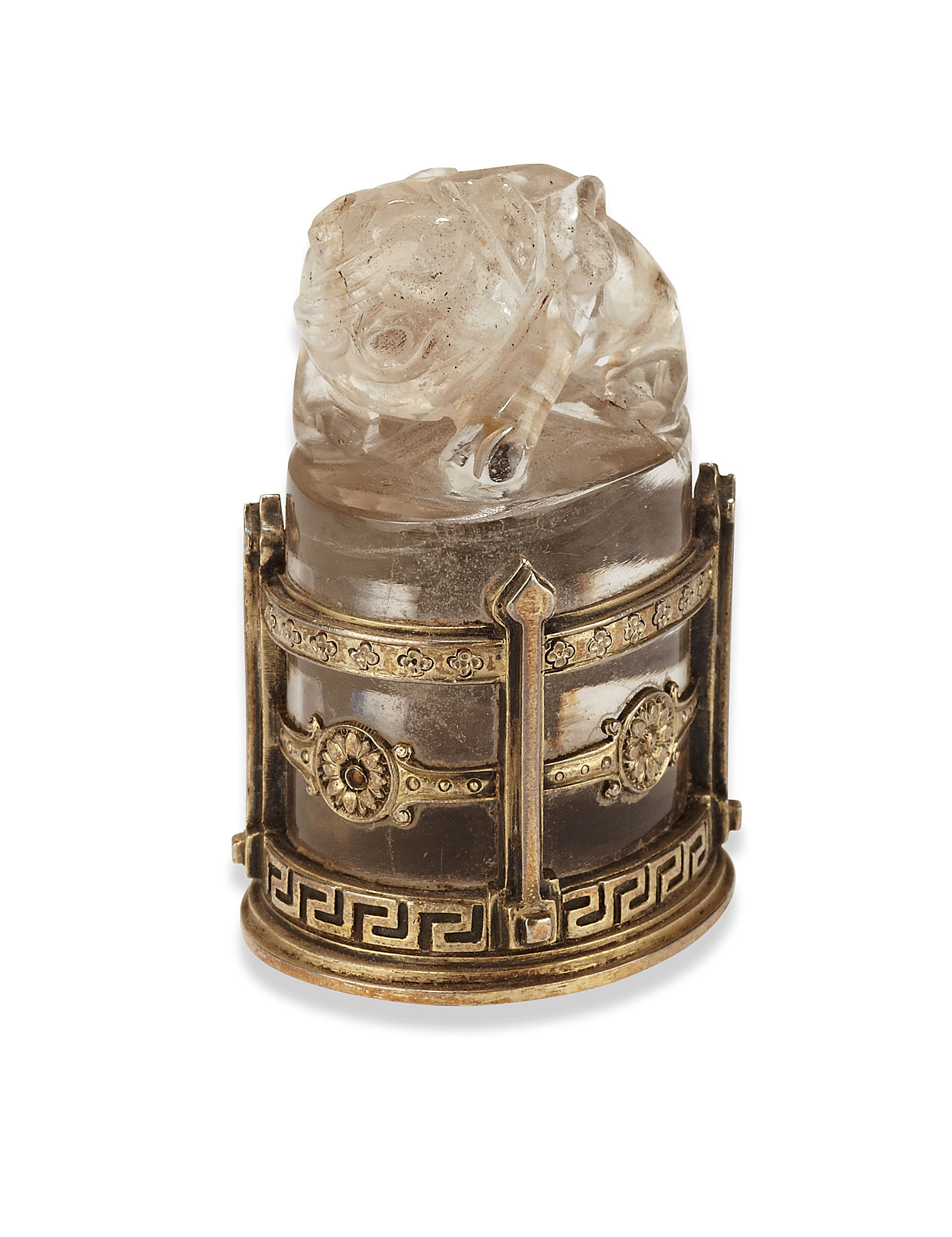 circa 1910-20, engraved 'Boucheron Paris' to the underside, of oval form with a kylin finial, the framework of open form, shaped uprights with pointed terminals, Greek key border, stepped base