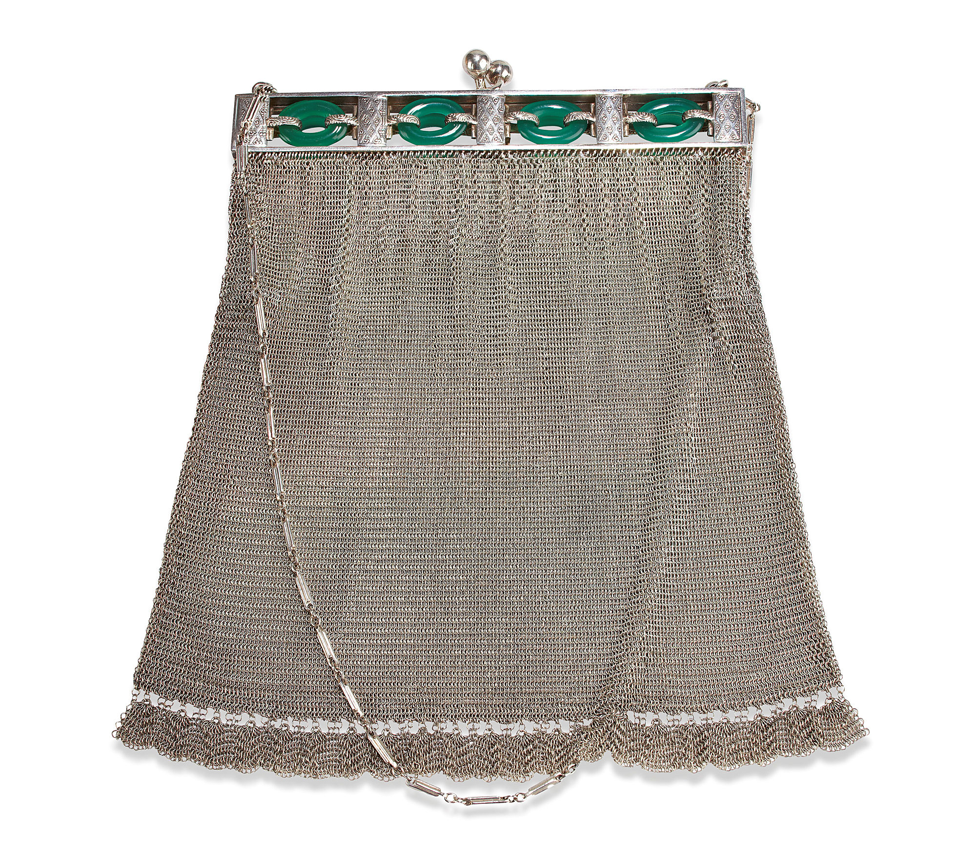 with import marks for London 1928/29, the pierced and engraved cantle incorporating slim oval green paste beads, suspended from a fancy link chain