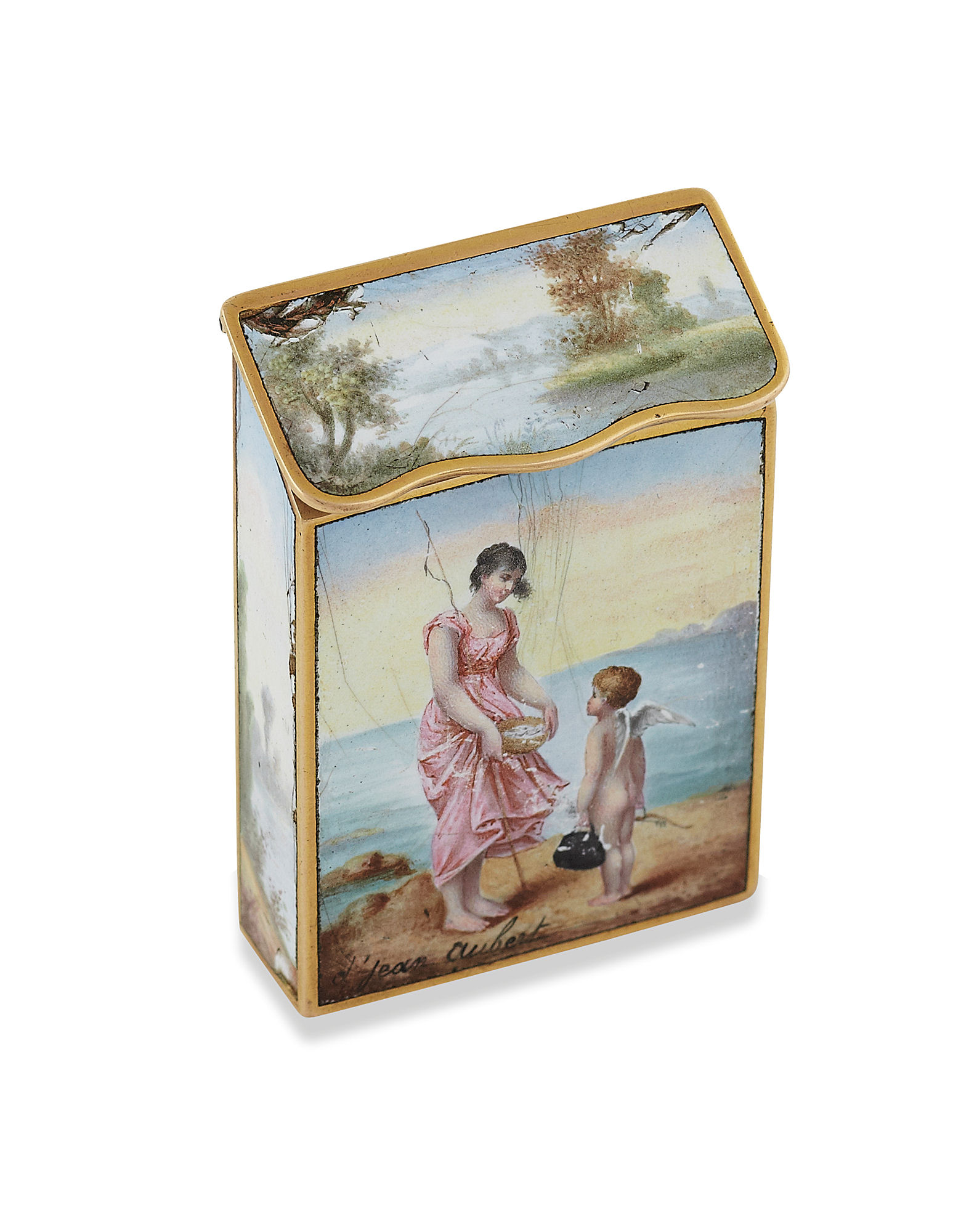 the rectangular case with enamel panels to front sides and covers, showing cherubs and putti within landscapes, the from panels signed d'Jean Aubert, the hinged cover with scalloped thumbpiece, with striker to base
