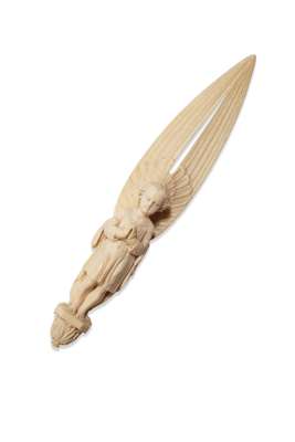 designed by Michaelangelo Caetani, made and retailed in the Castellani showroom, Rome, circa 1880, modelled as a standing angel, hands clasped in prayer and her wings elongated and upright forming the blade