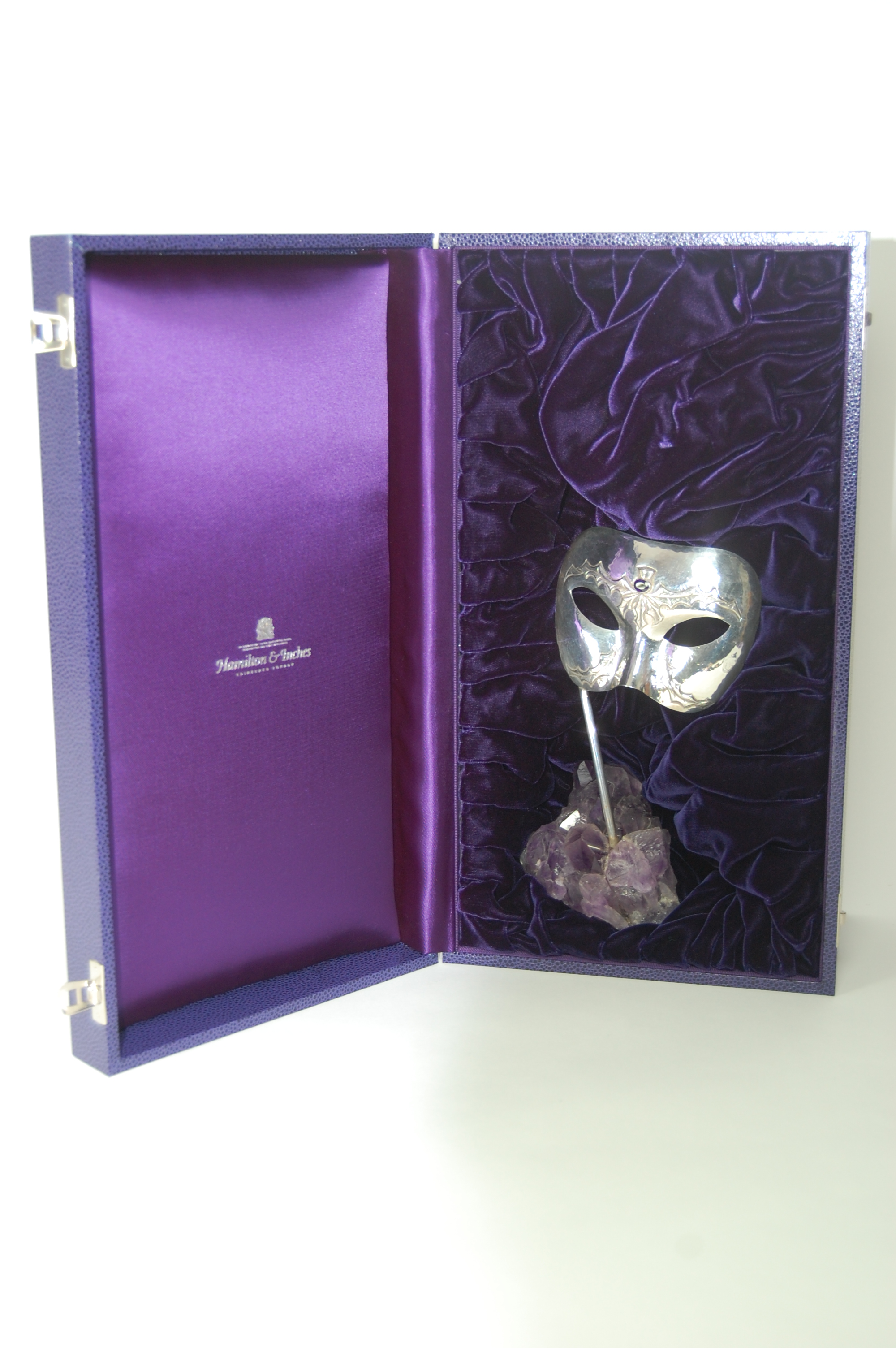 Hamilton & Inches, Edinburgh 2006, the mask of planished finish with embossed thistle detail, collet set with an oval cut amethyst, on simple straight stem on base of natural amethyst crystal, in original fitted case
