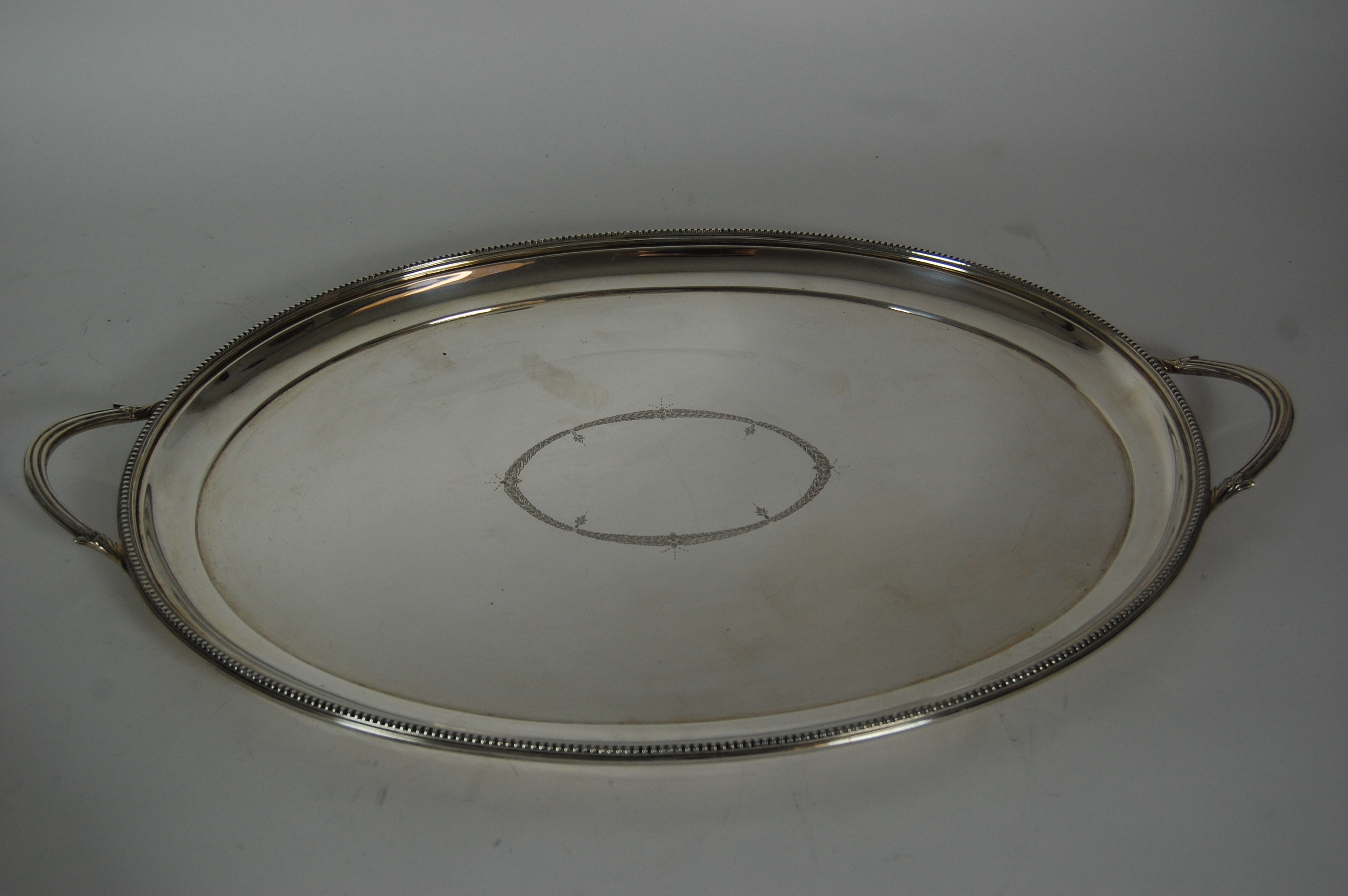 Asprey & Garrard, London 1998, of oval outline with beaded rim and twin reeded loop handles, the centre engraved with a foliate and flower head vacant cartouche
