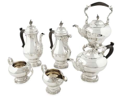 Asprey, London 1994, comprising spirit kettle stand and burner; coffee pot; water pot; teapot; milk jug and twin handled sugar bowl, the simple slight baluster bodies of plain form with rococo scrolls and oval cartouches, each with S scroll handles and acanthus caps, the domed hinged covers with foliate finials (6)