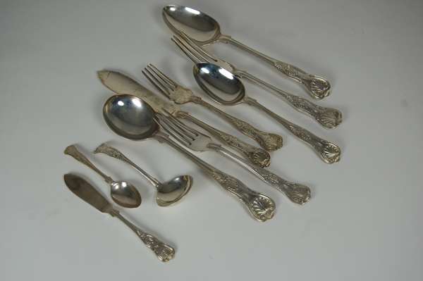 various dates Sheffield 1960's, comprising six of each fish knives and forks, dessert spoons and forks, table forks and three tablespoons, eight teaspoons, two sauce ladles, two butter knives, six silver handled table knives and matching dessert knives (qty)