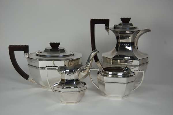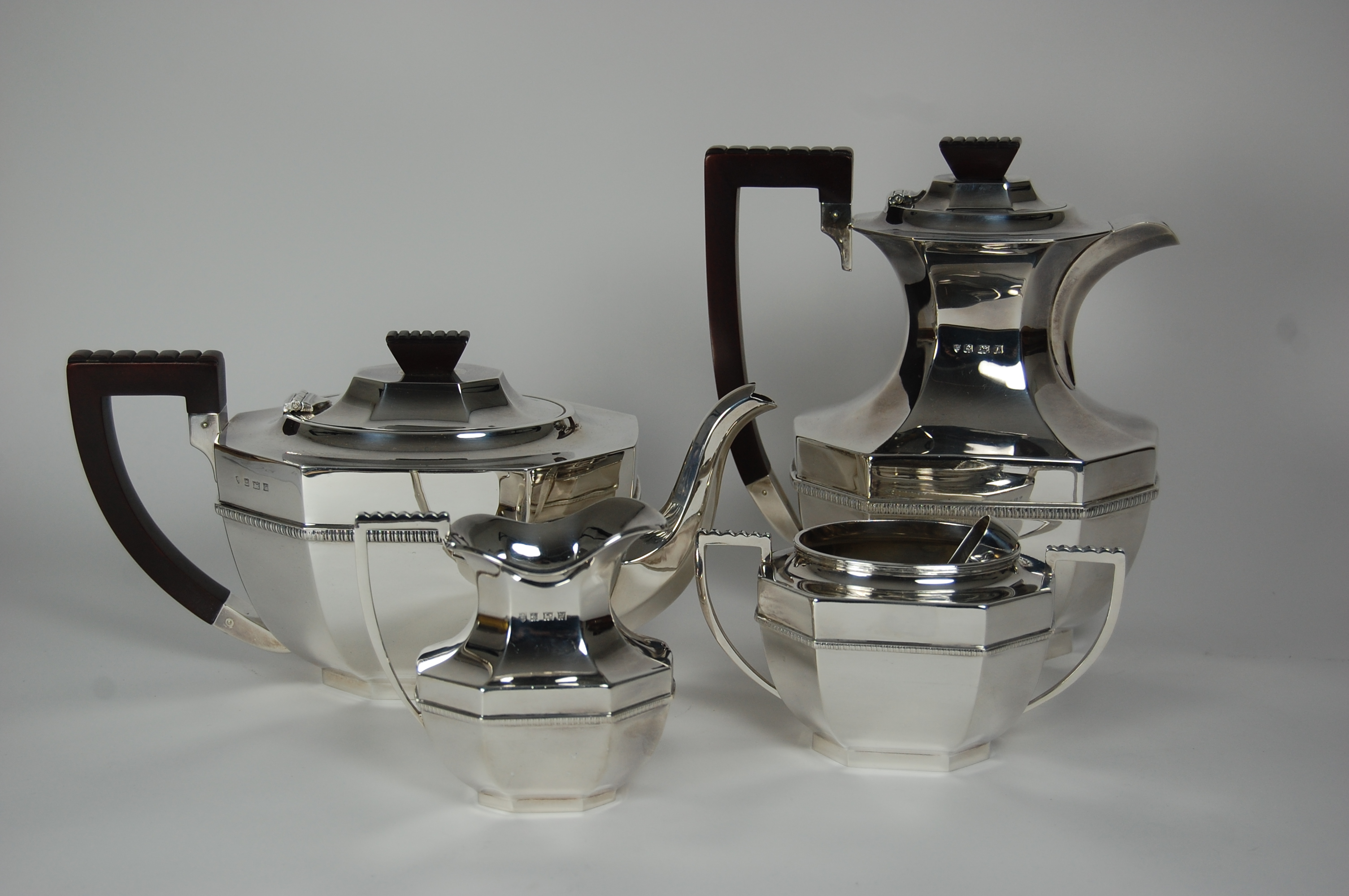 J B Chatterly & Sons Ltd, Birmingham, 1955, comprising water pot, teapot, twin handled sugar bowl and milk jug, each of panelled form with simple tapered bodies with ovolo borders, in original fitted case