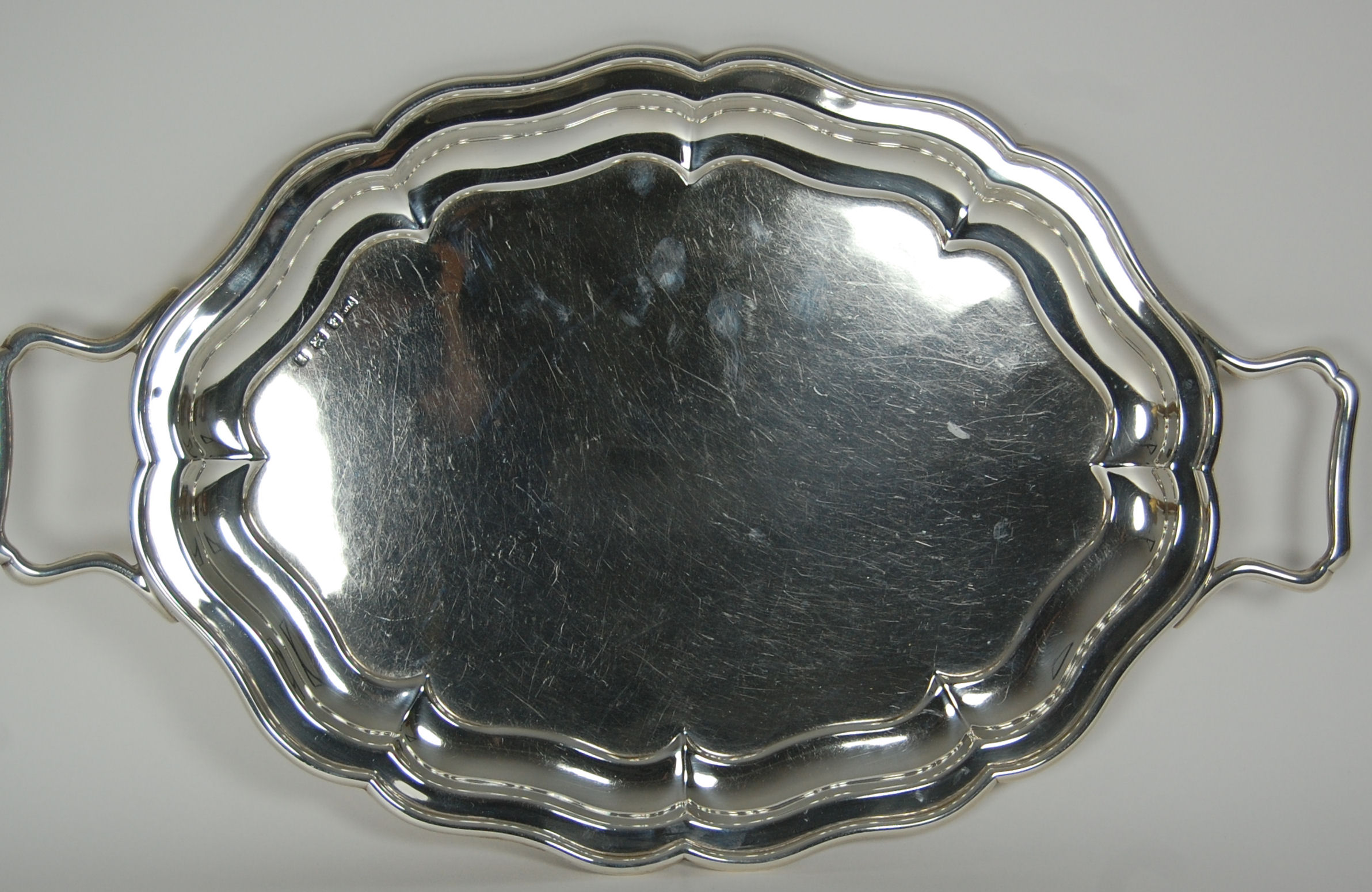 Viners Ltd, Birmingham 1930, of shaped oval outline with moulded rim and twin simple loop handles