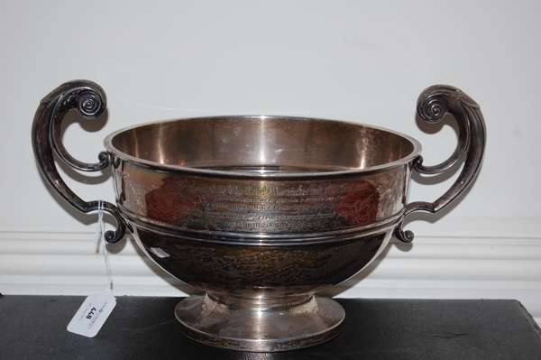 Walker & Hall, Sheffield 1916, of hemispherical form with reeded girdle and twin S scroll handles, raised on a simple domed foot, the body with presentation inscription