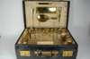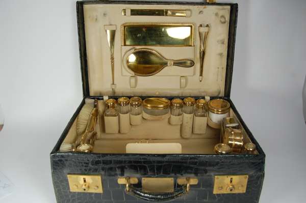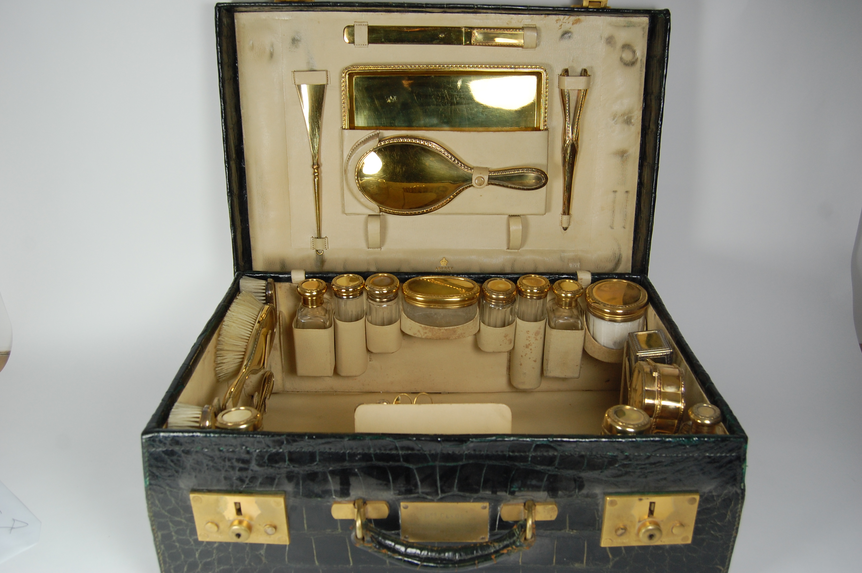 Charles & George Asprey, London 1904, the blue crocodile leather suitcase fitted with a large set of silver gilt dressing and travelling accessories, including dressing table tray, jars, bottles and brushes etc, also with a small carriage time piece, each with silver gilt mounts with ovolo foliate border