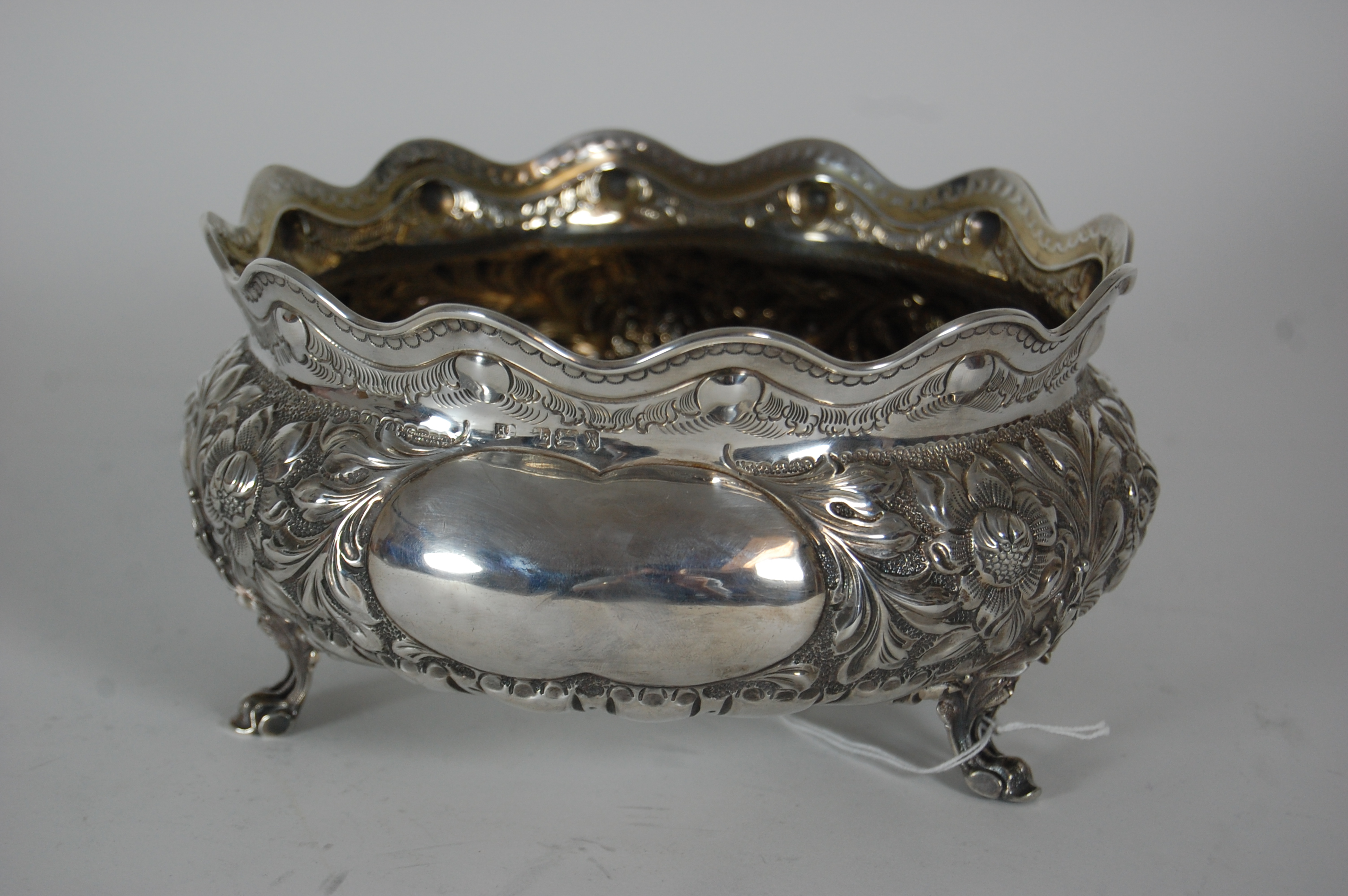 H Atkins Sheffield 1890, the baluster body with large embossed panels of flowerheads on a stippled background, with vacant oval cartouche, the upper border of simple foliate detail with scalloped rim, the whole raised on three cast and pierced foliate feet