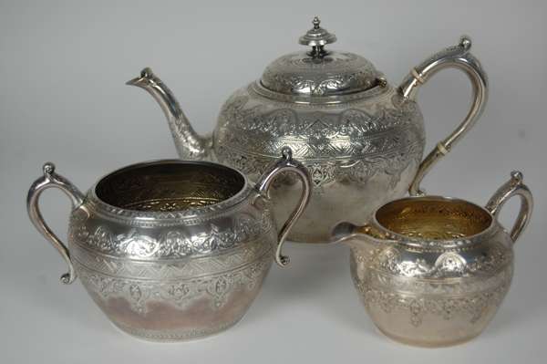 R Stewart, Glasgow 1883, comprising teapot, twin handled sugar bowl and milk jug, with simple slightly tapered bodies profusely decorated with chased scrolling borders flanking zig zag panels (3)