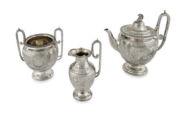 Martin & Hall, London 1880, comprising teapot, twin handled sugar vase, milk jug, each with finely engraved classical scenes within clasped acanthus borders, with a circular cartouche, engraved monogram