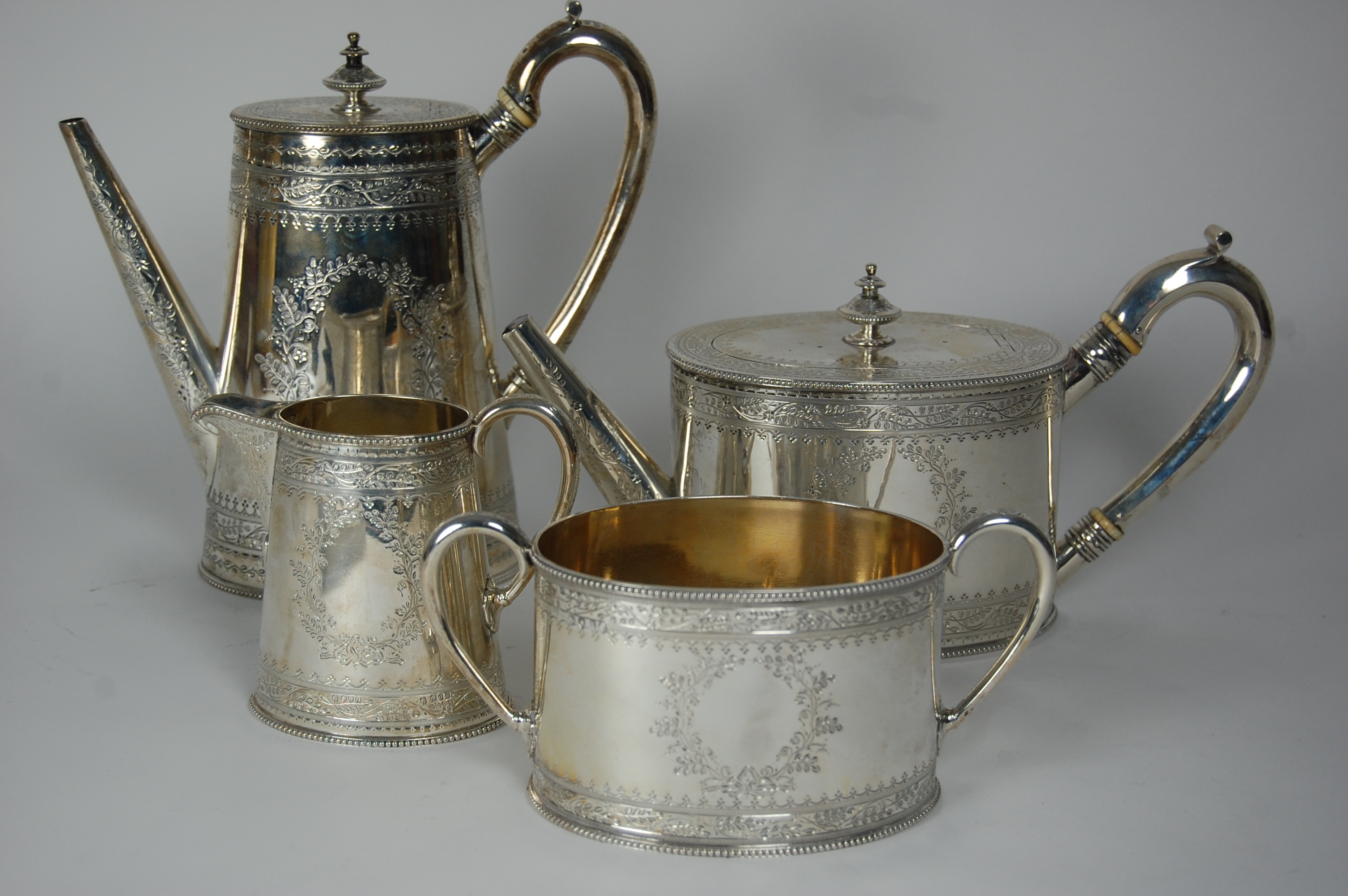 retailed by Goldsmiths Alliance, London 1876, comprising coffee pot, teapot, twin handled sugar bowl and milk jug, each of oval section with slightly flared bodies, the engraved borders of running foliage within prick engraved aches, (4)