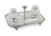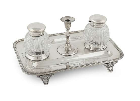 Martin & Hall, London 1875, the tray of rectangular outline with beaded rim, raised on four bracket feet, centrally set with twin cut glass inkwells, hinged domed covers and a taper stick, with pen tray above and below