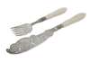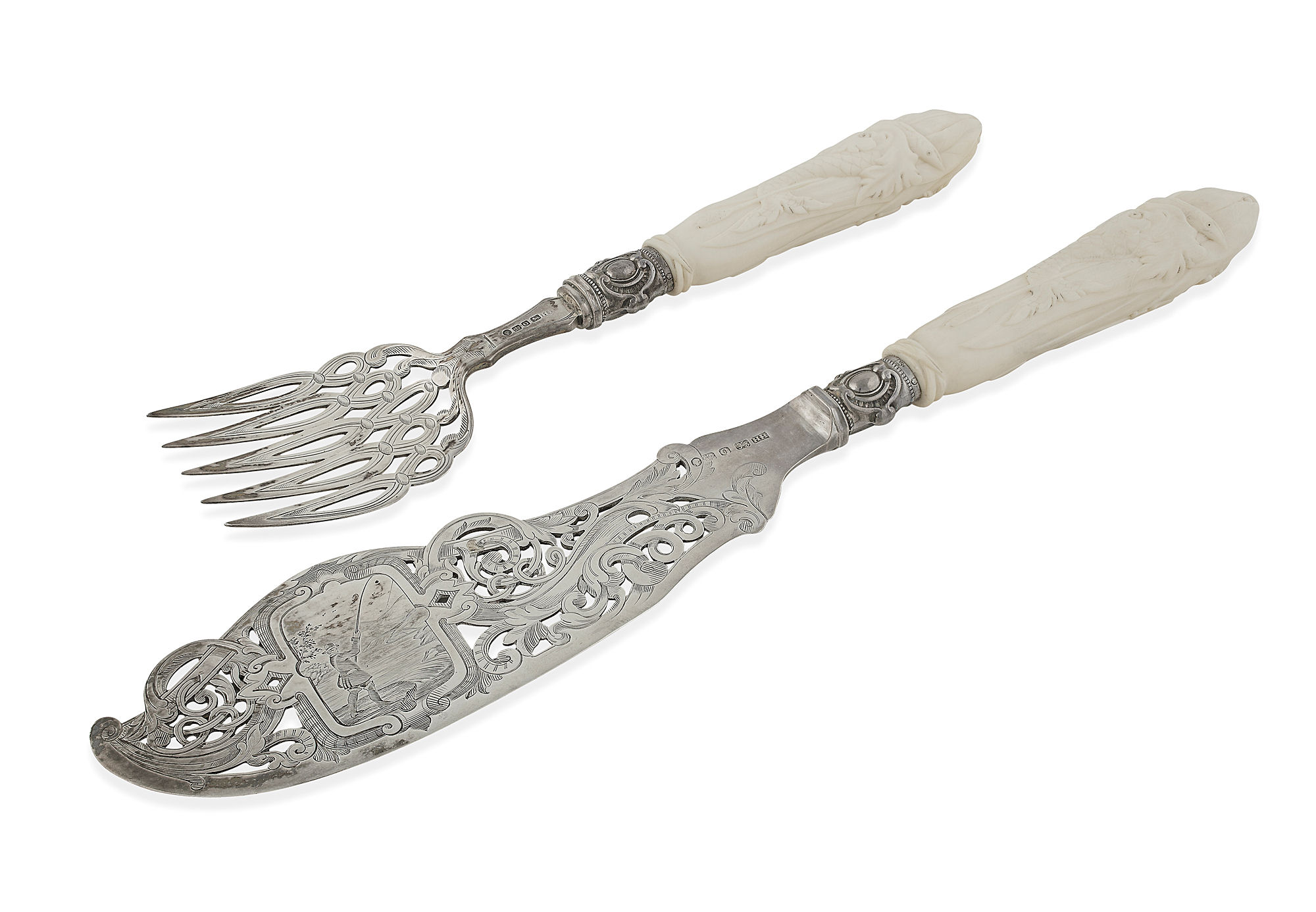 HH, Sheffield 1857, each with carved ivory handles with intertwined sea serpents, the knife with shaped and pierced blade with central cartouche panel with engraved scene of an angler to obverse and presentation inscription to reverse, the five tined fork with pierced and engraved decorations (2)