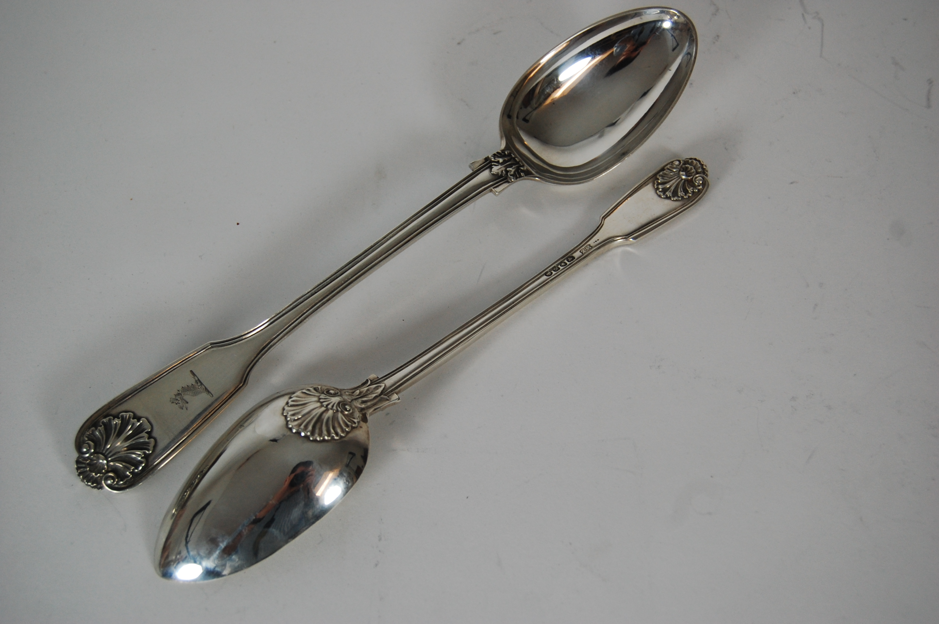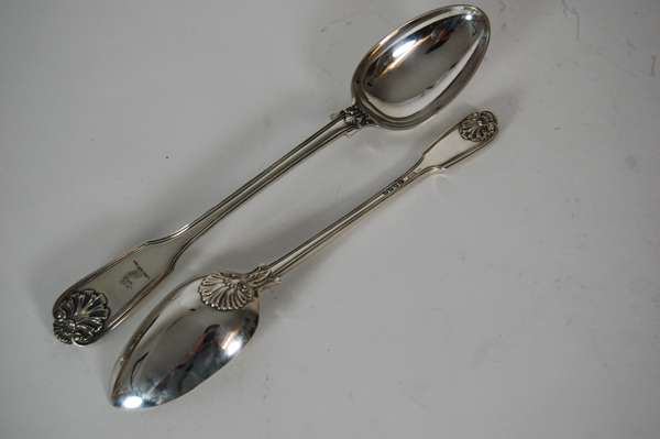 W Ealey, London 1832, of double struck Fiddle Thread and Shell pattern with shell heel, with engraved crest to terminal; together with a matched large tablespoon, 1836 (2)