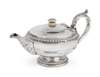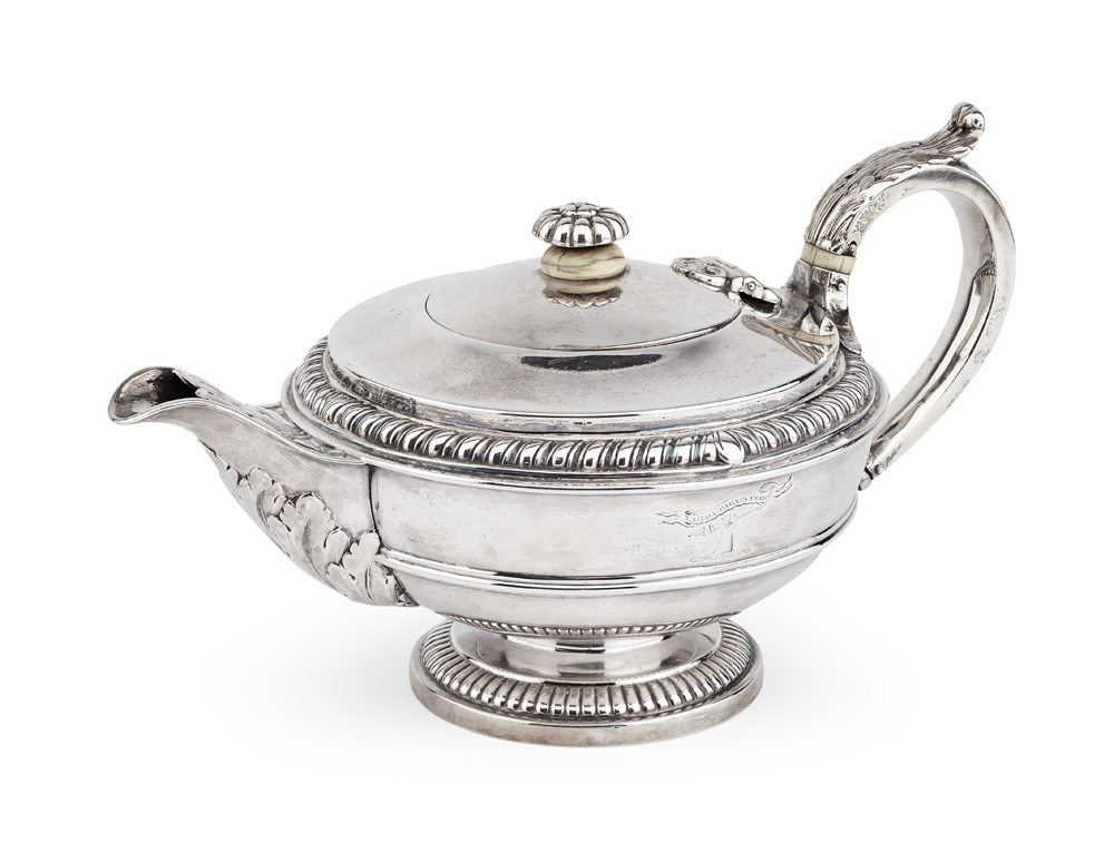Paul Storr, London 1810, of compressed form with reeded girdle and gadrooned borders and rims, the body with engraved crest and armorial, the large spout with acanthus details, 'C' scroll handle with foliate thumbpiece, the slightly domed hinged cover with foliate hinge and bun finial