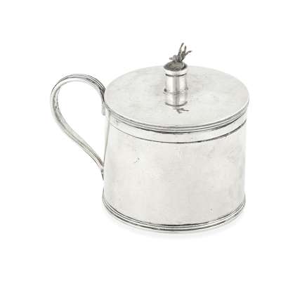 Thomas Holland II (possibly) London 1802, of simple drum form with reeded scroll handle and lift off lid with central sconce