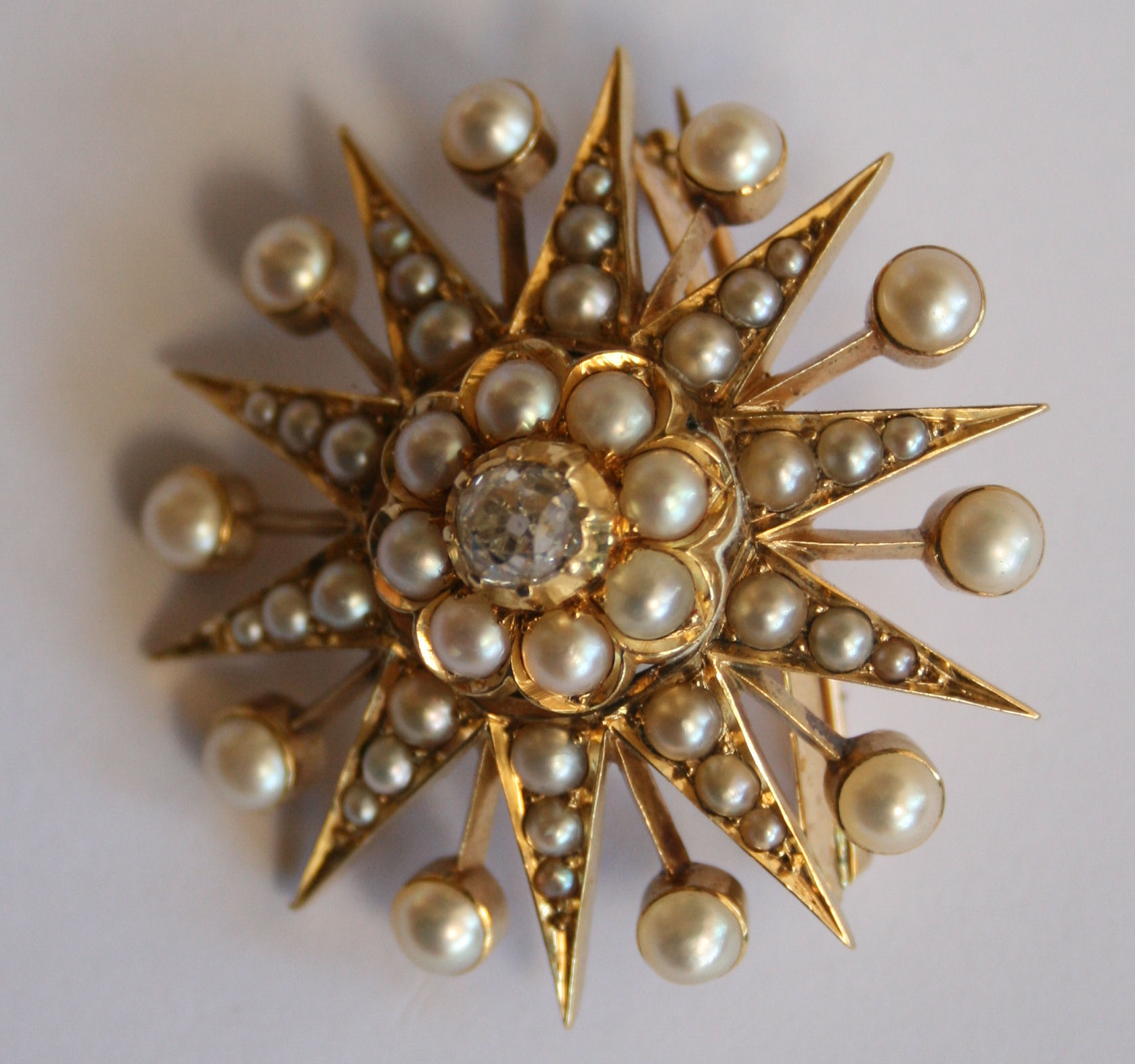 modelled as a star, the central circular section with an old mine cut diamond with a border of eight half pearls, radiating arms set half pearls, screw off brooch fitting with a folding bale for pendant fitting and a chain